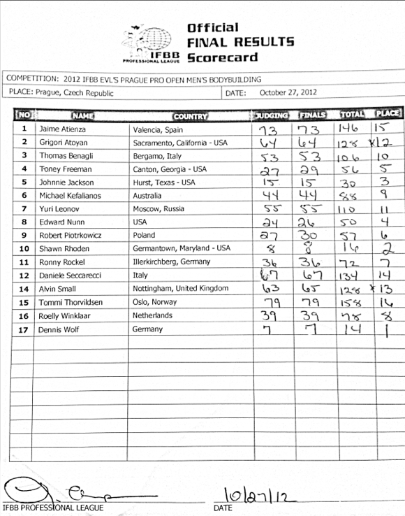 But Rhoden showed his first signs of wear and tear – which should come as no surprise considering he’s had to hold his conditioning nearly three months – and it was enough for Wolf to win by the narrowest of margins. The final scorecards had Wolf earning a two-point win, winning both rounds by a single point. With the win, Wolf earns an automatic qualification to the 2013 Olympia.
