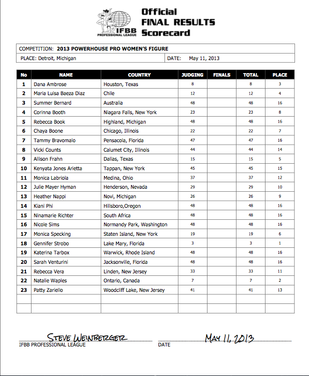 In Men’s Physique, Anton Antipov won for the first time in four professional contests. Antipov, who won the Overall at the 2012 IFBB North Americans, had placed 6th (Pittsburgh Pro), 4th (Europa Show of Champions) and 6th (Houston Pro) in three previous IFBB Pro contests. Michael Anderson and Tyler Anderson placed second and third, respectively.